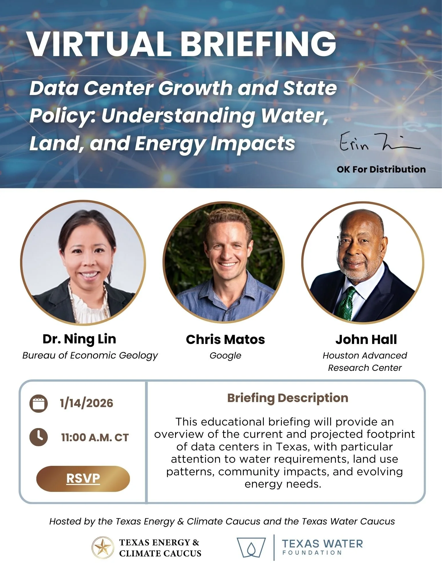 During this briefing, experts from the Bureau of Economic Geology, Houston Advanced Research Center, and Google shared practical insights on how data center development intersects with existing infrastructure, long-term planning, and resource stewardship. The discussion outlined considerations for siting, permitting, and mitigation strategies to help communities capture economic benefits while managing associated costs and risks.