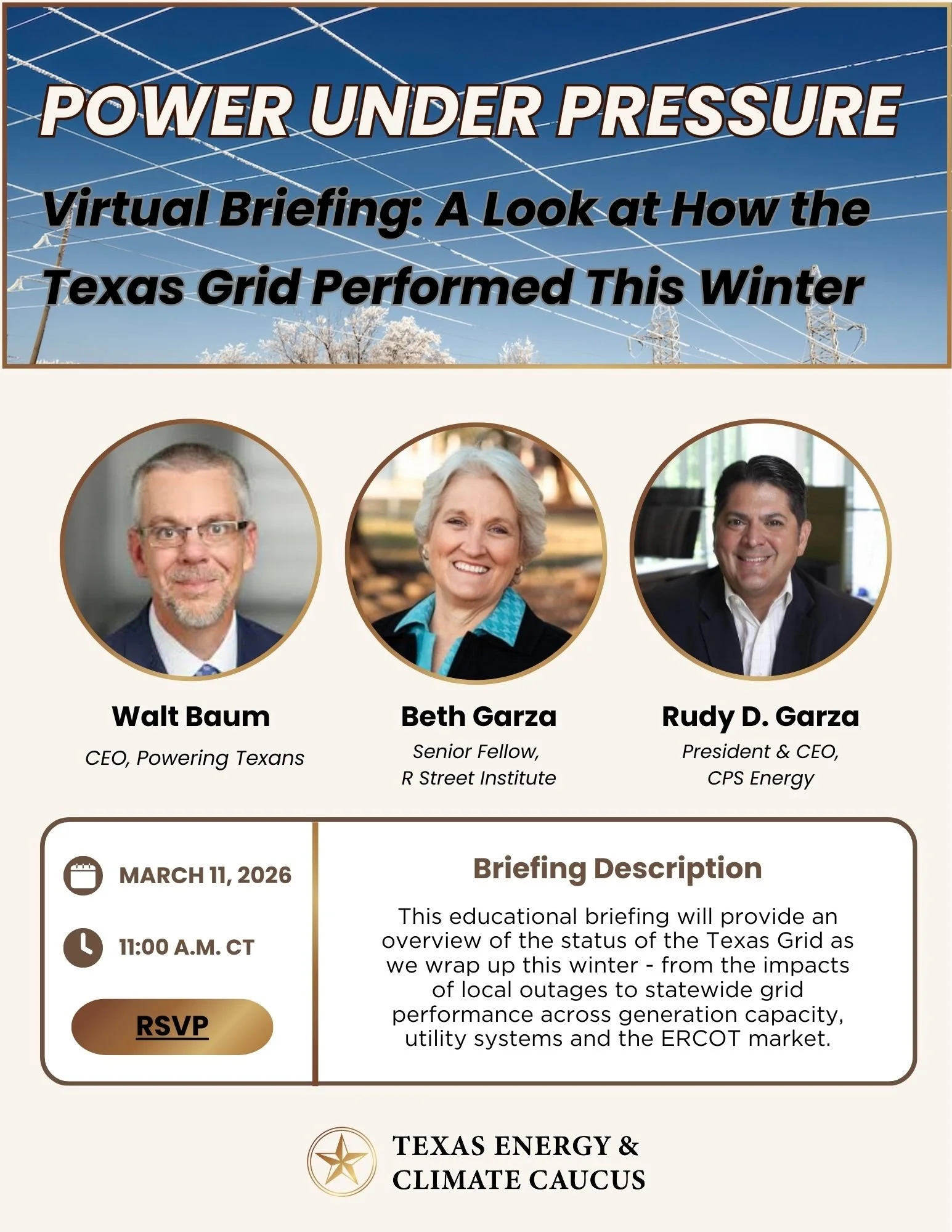 Join our next virtual briefing on March 11, 2026 from 11 AM to 12 PM, Power Under Pressure: A Look at How the Texas Grid Performed This Winter. This briefing is designed to equip attendees with a clearer understanding of what the recent Winter Storm Fern revealed about ERCOT grid resiliency in severe weather, as well as the upcoming legislative considerations to address remaining challenges.